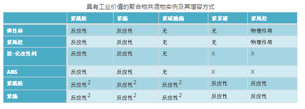 X——表示此類共混物的文獻報道較少;無——表示不需要有效增容即可獲得有用的聚合物共混物;反應性2——表示共混物之間共混時可原位生成有用的接枝或嵌段共聚物提高組分間的相容性